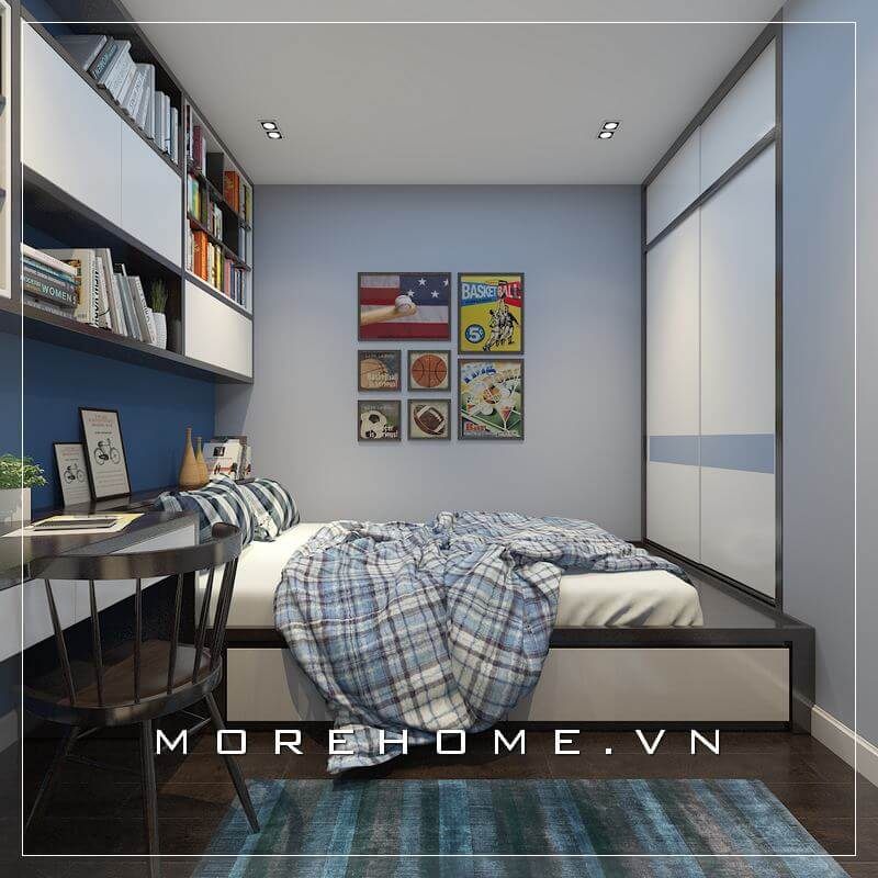 Bố trí nội thất phòng ngủ bé trai ấn tượng, tủ quần áo cửa lùa được đặt âm tường, kệ sách đơn giản treo tường cùng chiếc giường ngủ đa năng, tất cả tạo nên một không gian phòng ngủ nhỏ hiện đại, tiện nghi nhất
