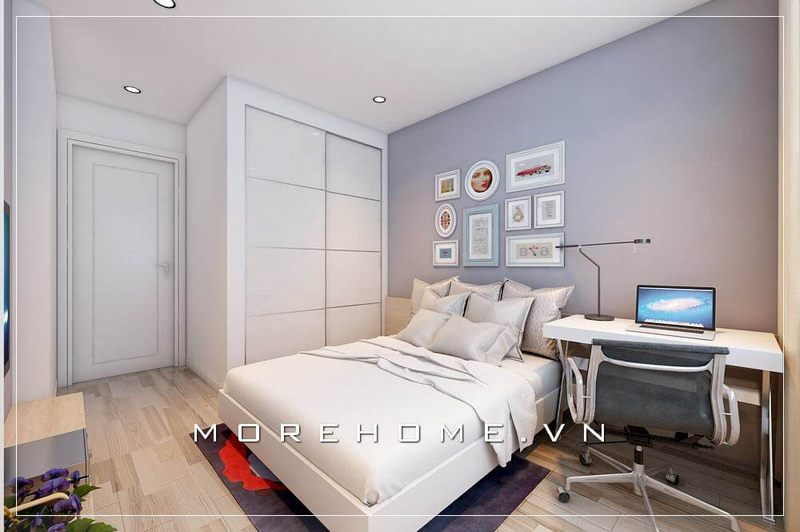 Không gian phòng ngủ được thiết kế theo phong cách thể thao, chiếc giường bằng gỗ công nghiệp vuông vắn hiện đại với gam màu trắng ưa nhìn.
