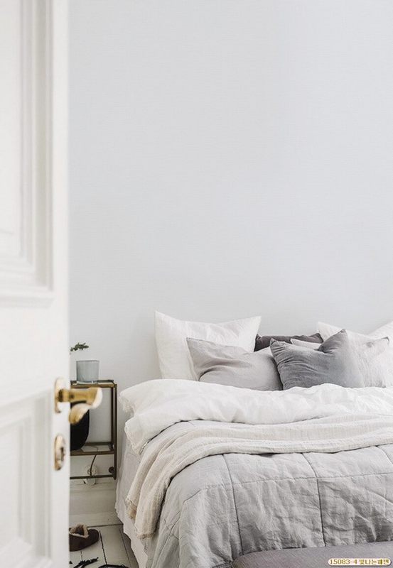 Bức tường được biến hóa tránh sự thô cứng bởi giấy dán tường đơn sắc màu ghi xám cho phòng ngủ