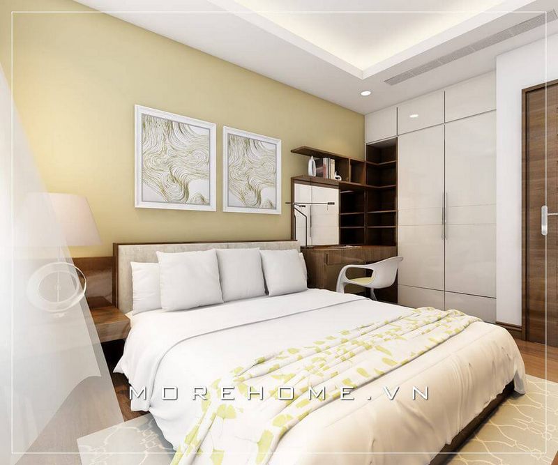 Giường ngủ chung cư được thiết kế theo phong cách hiện đại, trẻ trung, kết hợp tab liền kề tạo sự thuận tiện cho gia chủ trong quá trình sử dụng
