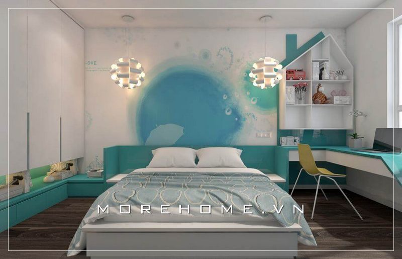 Mẫu thiết kế giường ngủ trẻ em hiện đại, với phần cách điệu đầu giường kết hợp tab tiện dụng mang đến sự thoải mái cho phòng ngủ của bé