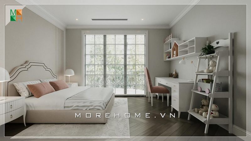 Mẫu giường ngủ con gái tại nhà phố hiện đại, tab đầu giường liền mạch tạo sự thuận tiện cho con trong quá trình sử dụng